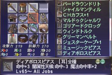 さて今回はこの固定では初めて詩人を出す事になりました。エレジーを入れる事が前提でとはいえ、1試合中2~3回ほどしか入っていなかったので、私がエレジーをきちんと入れる検証かねてやることにしました。結果を言いますと、戦場のエレジーも込みで14回中8回しか入れられてませんでしたが!なんとモグに戻って楽器を片付けようとしたらホルンがなんと忘れてたみたいです^^; なので持っていってれば100%になったのではないでしょうか?次回どれほど入るか検証しますが、私の装備とスキルを参考にしていただければと思った次第です。
